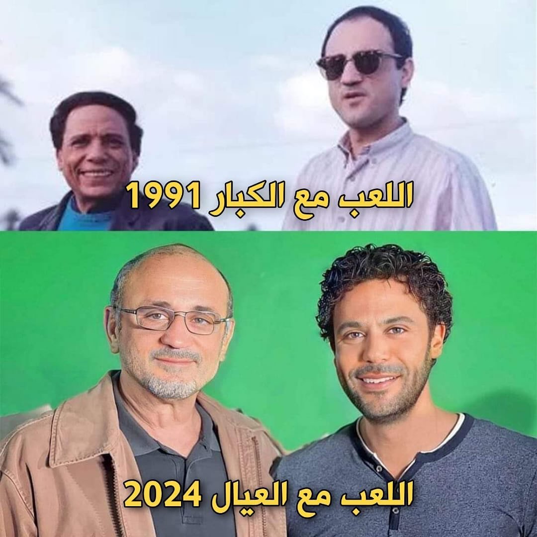 قارن محمد إمام بين الصورتين الأولى للمخرج شريف عرفة مع الزعيم عادل إمام، بفيلم اللعب مع الكبار عام 1991، والثانية له مع شريف عرفة أيضا بفيلم اللعب مع العيال عام 2024.